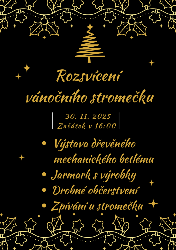 Již tradičně proběhne rozsvícení vánočního stromečku a to 30. 11. 2025. Začátek je v 16:00, rozsvícení proběhne zhruba v 17:00 hod. Zatím se můžete těšit na trhy se sladkým občerstvením, medem, 3D výrobky a charitativní stánek. K dispozici bude malé občerstvení a výstava dřevěného mechanického betlému.